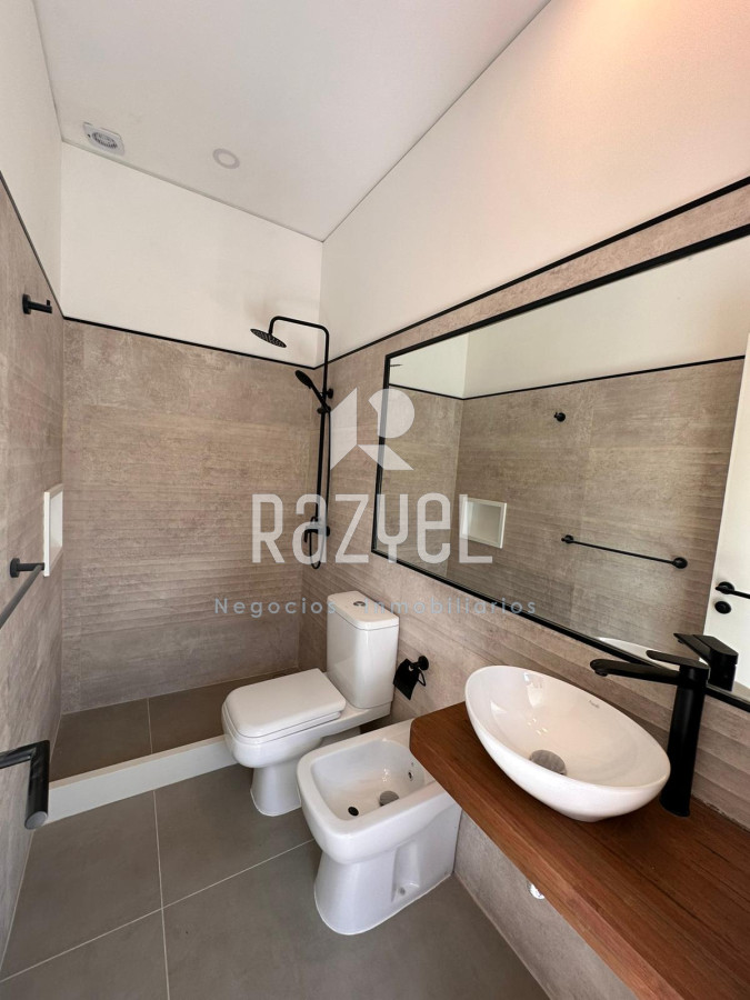Dormitorio con baño en suite con doble pileta y vestidor.